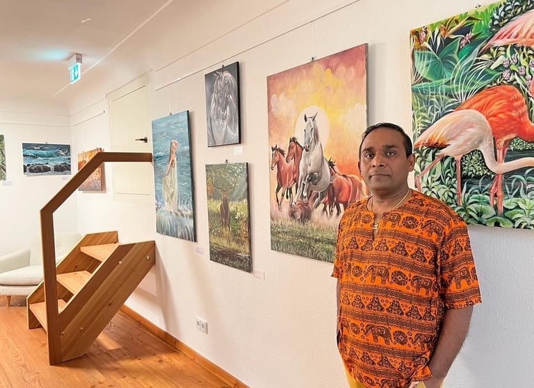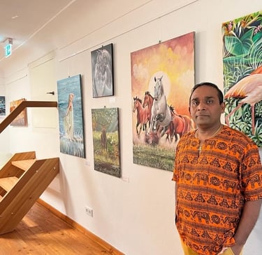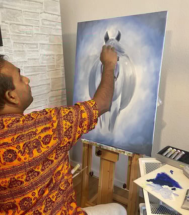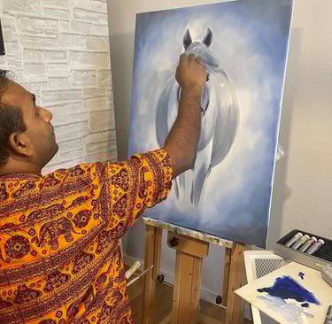 Enough about music; let's concentrate on my artistic side, as that is where I gravitated. Around the time I was twelve, I developed a love for sketching and began assisting my father with all of his paintings. Most of my artwork is centred on my interests in nature, animals, and portraiture. My preferred medium for creating art was acrylic paint, and working with them was tricky. So I made the long journey to Italy, where I resided and worked for almost thirteen years, gaining experience by participating in shows like "Arte sotto I Portici." A memorable experience it was.